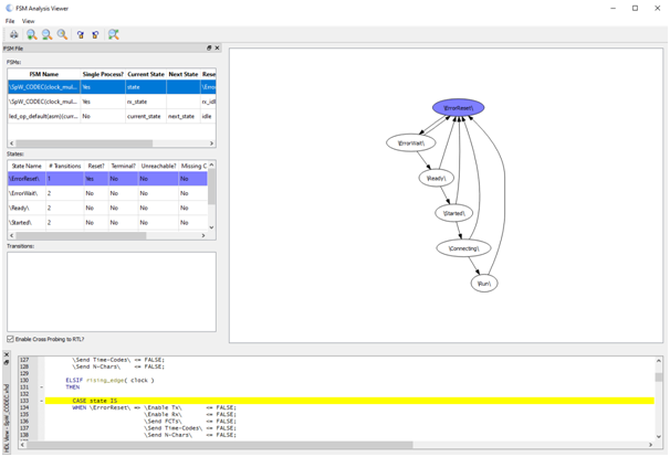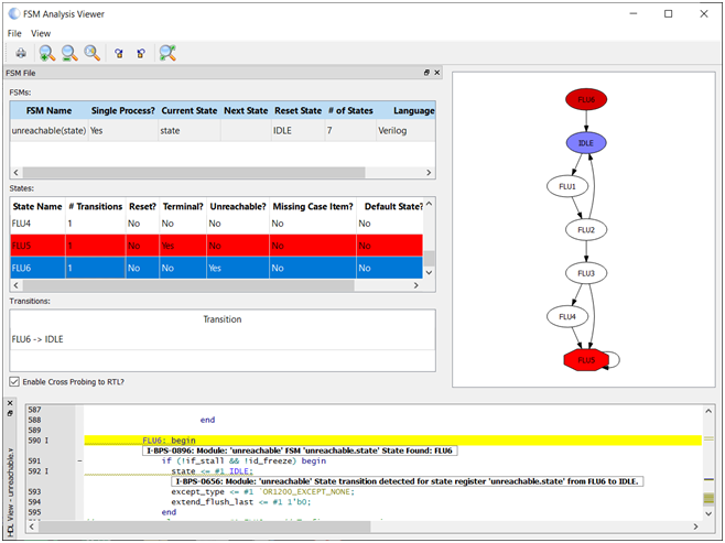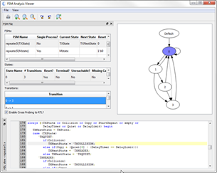 While the schematic viewer is excellent for enabling developers to understand the architecture of the design, the FSM viewer enables developers to view the state diagram for each Finite State Machine (FSM) within the design. Just as with the schematic viewer, each state machine, transaction, and state can be cross-probed with the RTL, enabling a deeper understanding of the particular FSM.