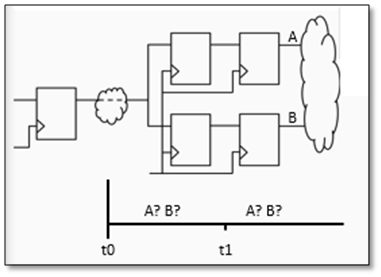 Another CDC issue that must be addresses is that of data reconvergence, when two data signals are combined after being independently synchronized between the same two clock domains. This is a problem because synchronization is inherently an arbitration to avoid metastability. A new value will be correctly clocked, without metastability, on one of two successive receiving clock cycles. There’s no way of knowing which. The two signals in question can be arbitrated differently and can end up being clocked into the receiving domain on different clock cycles when correct operation depends upon their remaining in step. Think again of the coin toss. With a single bit, it’s all but certain that the coin will end up either heads or tails, but with multiple bits, you’d need either all heads or all tails. That’s a losing bet.