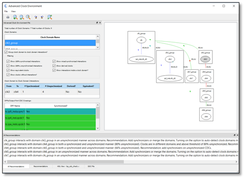 Blue Pearl Software’s Advanced Clock Environment (ACE) provides a graphical representation summarizing data paths between clocks and can make recommendations for grouping of clocks into clock domains. With ACE, designers can identify clocks to better understand how they interact with synchronizers in the design. This allows users to quickly identify improper synchronizers or clock domain groupings that cause CDC metastability.