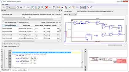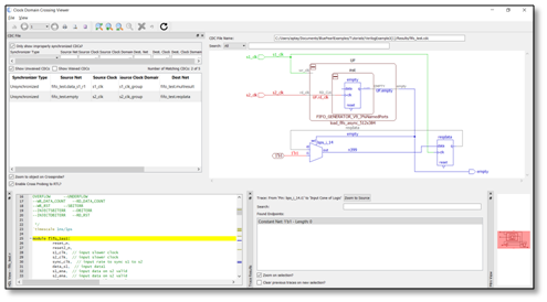 Next, the Visual Verification Suite’s CDC Analysis understands FPGA vendor clocking schemes, saving enormous resources to set up designs. The CDC analysis has built-in intelligence that helps set up the CDC run and rapidly debug issue found using the built-in cross-probing and schematic display.