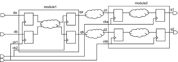 To illustrate how Grey Cells improves CDC analysis accuracy while dramatically reducing runtimes, consider the diagram shown in Figure 2 where the entire RTL descriptions of “module1” and module2” are available. It is apparent that both outputs of module1 should be synchronized, since ck1 is connected as the input clock and ck2 as the output clock. Also, synchronization is required at the d2 input of module2, since ckb is connected to ck2. There are no CDCs within module2. Since all the details are known, a CDC analysis will reveal whether synchronization has been properly implemented, but the analysis may take a long time if both modules are large and complex.