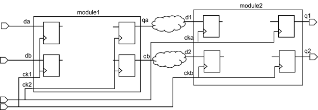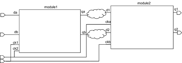 In Figure 3, both module1 and module2 have been replace by black boxes. All information about which clock is associated with which data pin has been lost. In fact, it’s only by guessing based on the signal names that you might infer that each module has two clocks. In this example, CDC analysis is not possible.