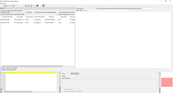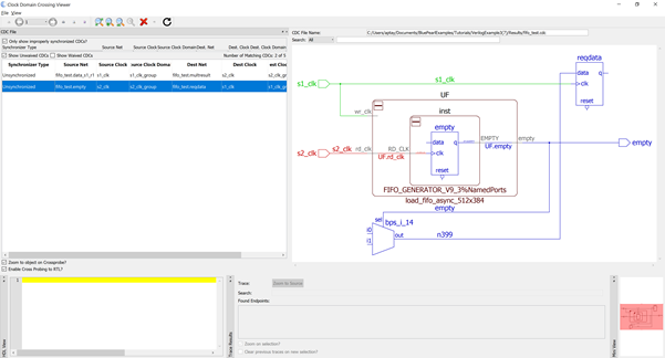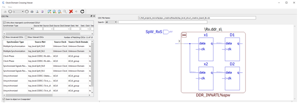 CDC analysis involves finding issues which will result in metastability within Flip Flops (FFs) because of data crossing clock boundaries. Unsynchronized CDCs represent the bulk of the problem for FPGA and ASIC failures in the field according to recent studies. The Visual Verification Suite identifies unsynchronized CDCs with source clock, destination clock and target FFs information so they can be quickly found and fixed.