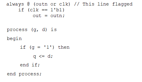 Another common example of code quality issues is missing assignments in IF and Else blocks and case statements that will cause most synthesis tools to create latches in the design along with the registers. Implied latches can cause issues with timing, and different synthesis tools will do this in different ways, so change vendors, change implementations.