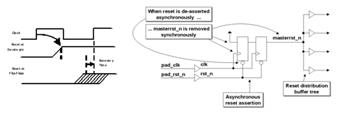 Another code quality issue is synchronous de-assertion of asynchronous resets. Some people pay little attention to how their reset will work in the real world. They just throw in a global reset just so the simulation looks “tidy” at Time Zero, but this isn’t enough. That reset must work in the real world. Keep in mind, a global reset is just that, global, so it has a large fanout and may have a significant delay and skew, so you need to buffer it properly. And because this reset is asynchronous, by definition it can happen at any time, and it forces the flip-flops to a known state immediately. That’s not a problem, but the de-assertion issue comes not when your reset pulse begins, but when it ends relative to the active clock edge. The minimum time between the inactive edge of your reset and the active edge of your clock is called recovery time. Violating recovery time is no different than violating setup or hold time. The easiest way to avoid this issue is to design your reset as shown here. The active edge can happen at any time, but the inactive edge is synchronous with the clock.