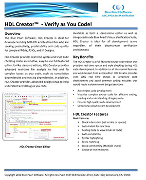 Blue Pearl Software’s HDL Creator code editor is ideal for developers coding both RTL and test benches who are seeking productivity, predictability and code quality for complex FPGAs, ASICs, and IP Designs.
